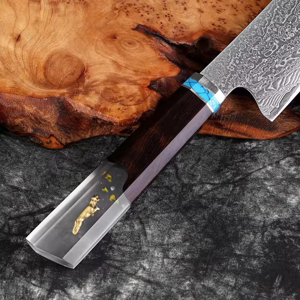 Kiritsuke Damascus Japanese Chef Knife - Resin Stabilized Wood Handle